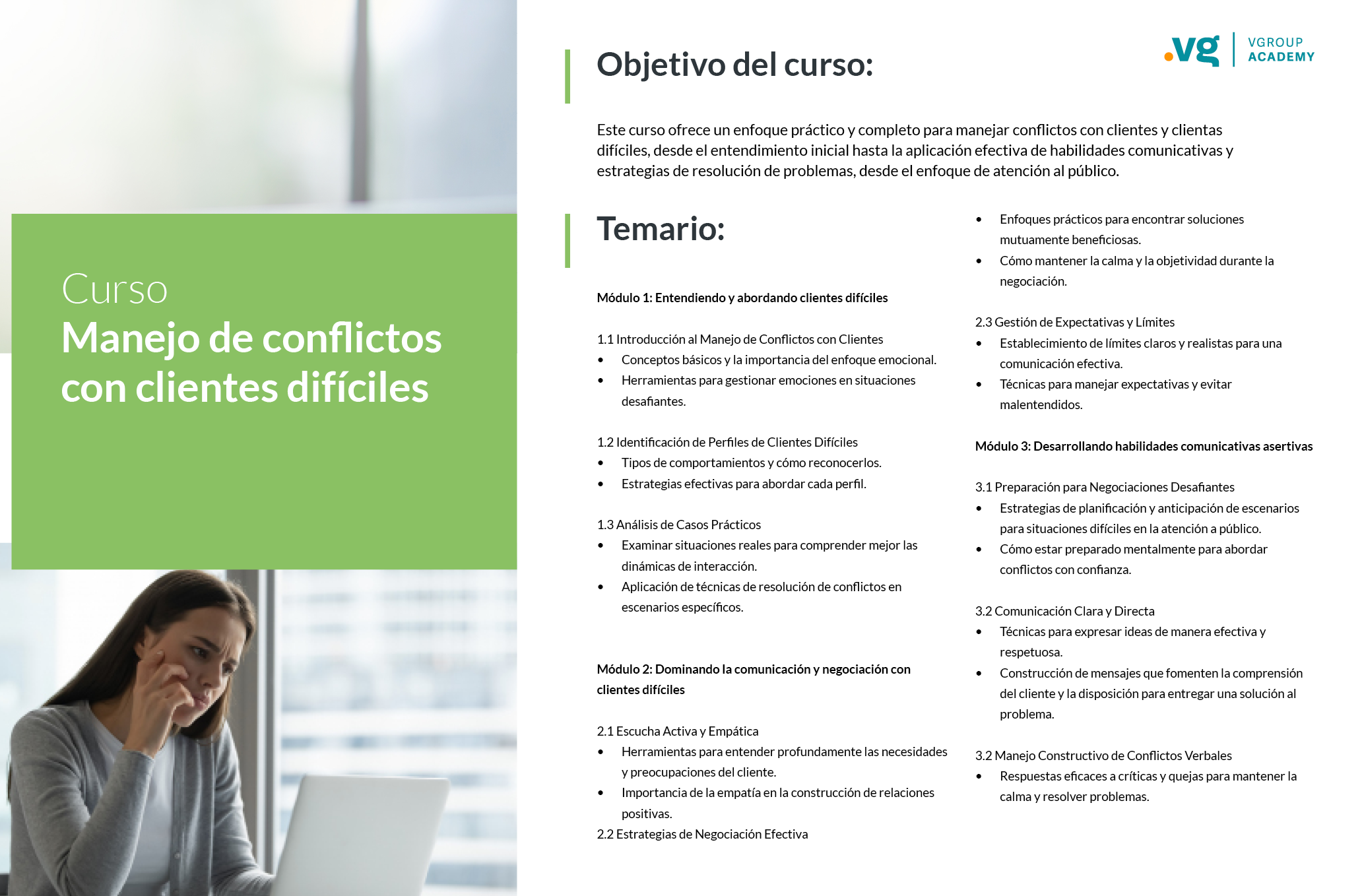 Este curso ofrece un enfoque práctico y completo para manejar conflictos con clientes y clientas difíciles, desde el entendimiento inicial hasta la aplicación efectiva de habilidades comunicativas y estrategias de resolución de problemas, desde el enfoque de atención al público.